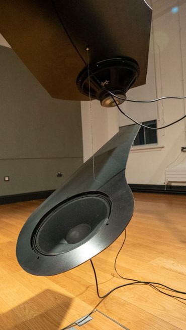 The way in which you performatively engage with the sculpture, moving around it in the space, is important to the work as a listening experience. You may start to notice areas where the frequencies cancel each other out or new ones seem to reveal themselves as the sound starts to reveal the acoustics of the room itself. The sonic performance of the sculpture is something which emerges from the material relationships enacted within it. I visually include the hardware in the presentation as their agencies have equally distinct roles in that relationship.