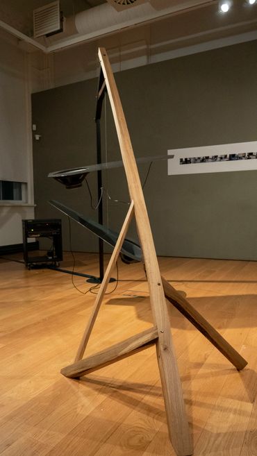 I chose green Oak as the material to make a structural frame from as the material is irregular and in a state of flux. The water content of the wood changes over time causing it to move, twist and crack eventually coming to a somewhat stable state. The poetic nature of this process resonates with the way in which I am generating sound. Although it may not be as apparent as the metal vibrating before your eyes, the frame itself is also proceeding with its own dynamic changes but on a much longer and perhaps imperceptible time.