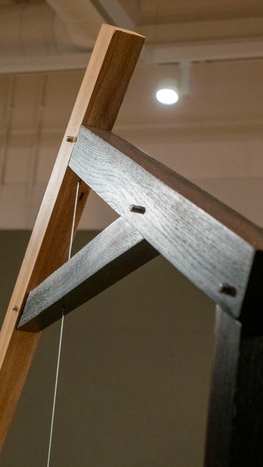 The colouration of the frame is a material relationship that was revealed in processing the material and training at a specialist in oak framing. The Iron in the steel of the tools reacts with the tannins in the oak to produce the hue you see. I dissolved the steel fillings created from cutting the metal in the work to create a ferrous wash. This is a chemical reaction which exists within the two materials and the effect is distinct to the relationship of these pieces of oak and the steel I am using to create sound.
